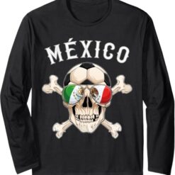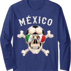 Mexico Pirate Soccer Fan Skull Long Sleeve T-Shirt with Mexican Flag