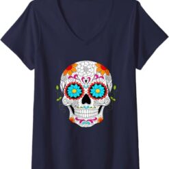 Women’s Colorful Calaveras de Azúcar Dia de los Muertos V-Neck T-Shirt – Mexican Sugar Skull Design