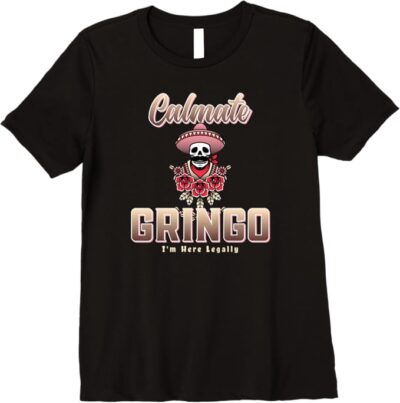 - Show Off Your Chicano Pride with Humor: The “Calmate Gringo I’m Here Legally” T-shirt is designed for proud Mexican men and women who embrace their Chicano heritage with humor and confidence.