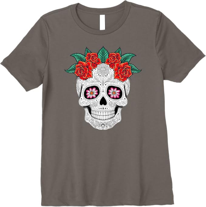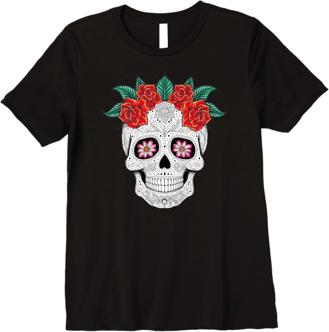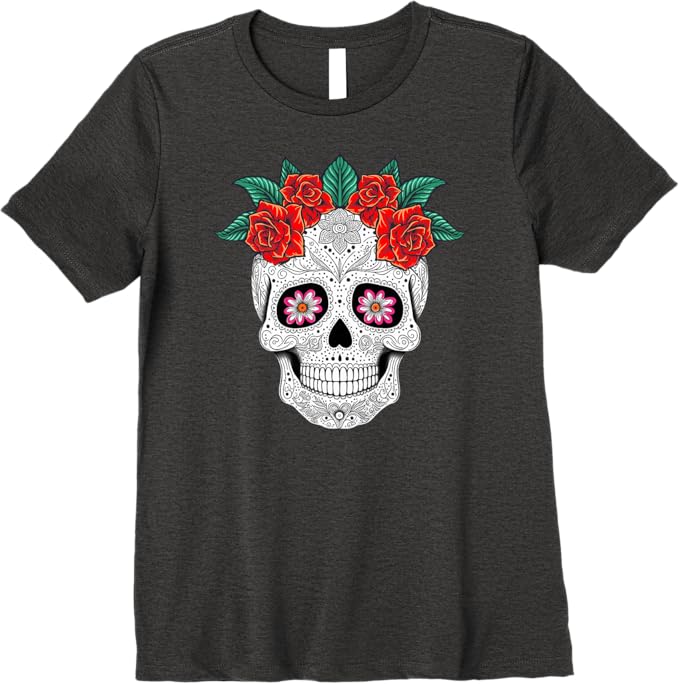 Day of the Dead Skull with Floral Design: This t-shirt features a stunning Day of the Dead skull adorned with vibrant flowers, beautifully capturing the essence of the Mexican holiday and honoring the tradition of Día de los Muertos.