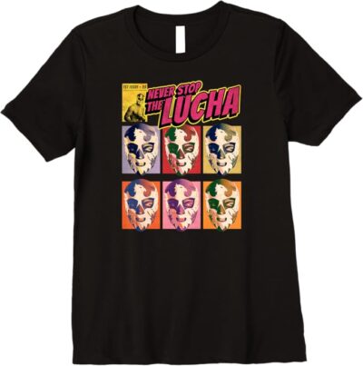 - Show your love for Mexican Lucha Libre with the “Never Stop The Lucha” t-shirt, celebrating the strength, passion, and tradition of this iconic Mexican wrestling style.