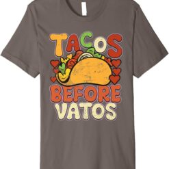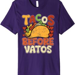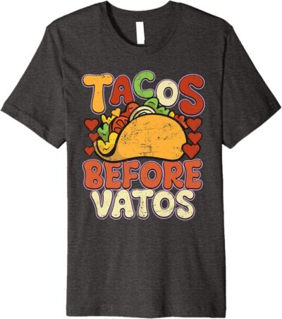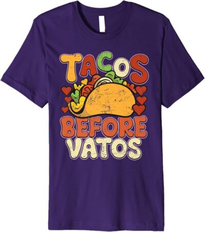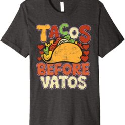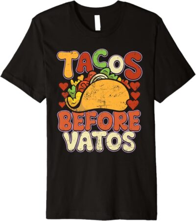 - Show off your love for tacos and Mexican culture with the “Tacos Before Vatos” t-shirt, featuring a fun and bold design that puts tacos above all else, a true statement for every taco lover.