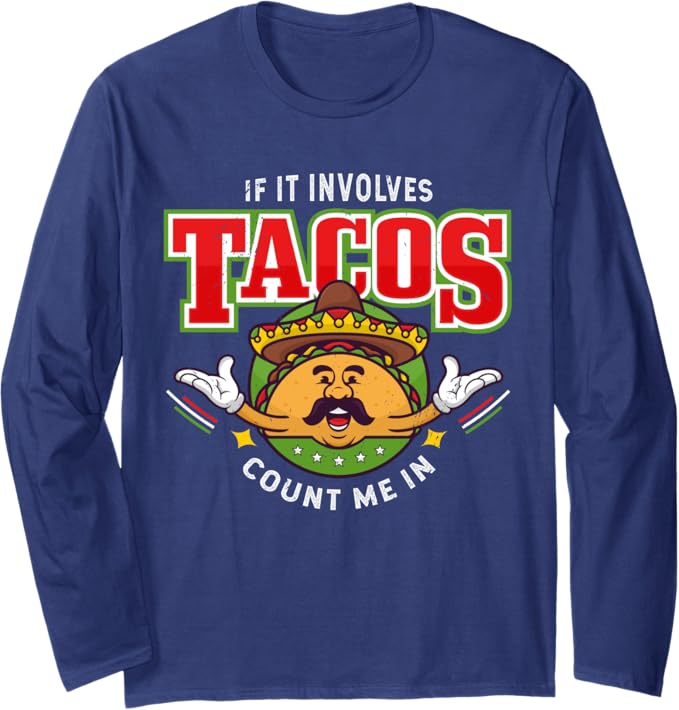 Funny Chicano Mexican Taco Long Sleeve T-Shirt – ‘If It Involves Tacos, Count Me In