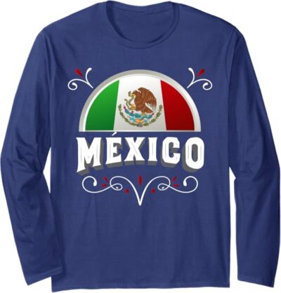 Mexico Bandera Flag Long Sleeve T-Shirt with Mexico Lettering