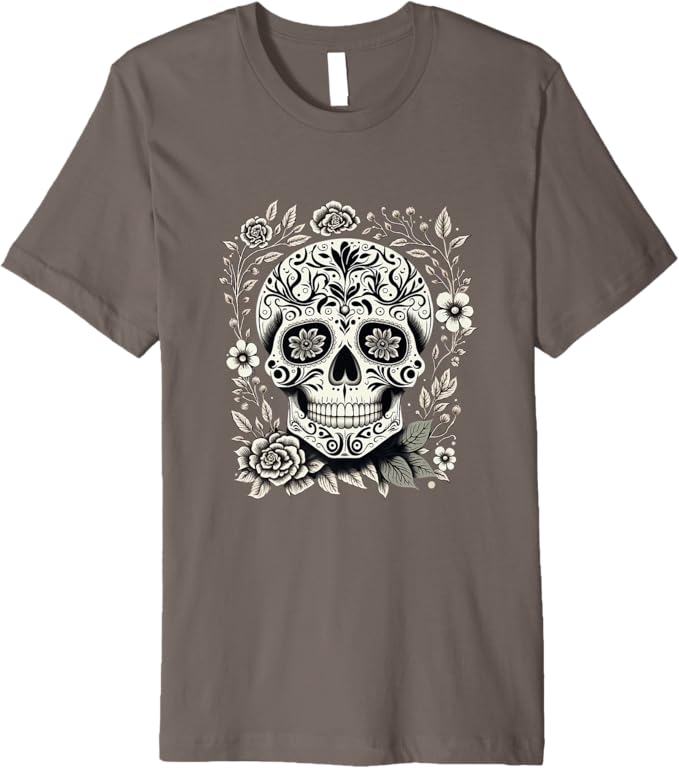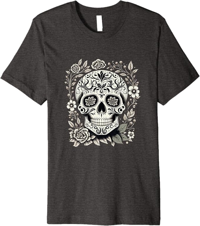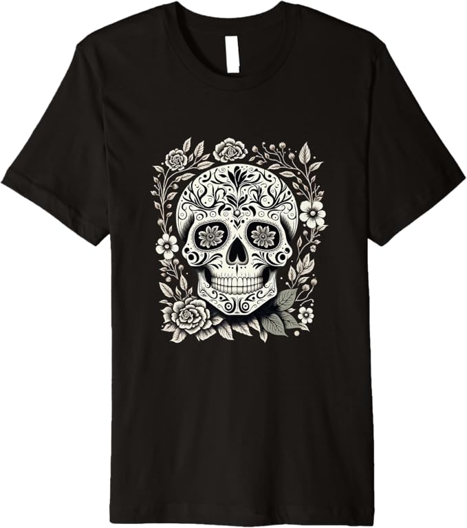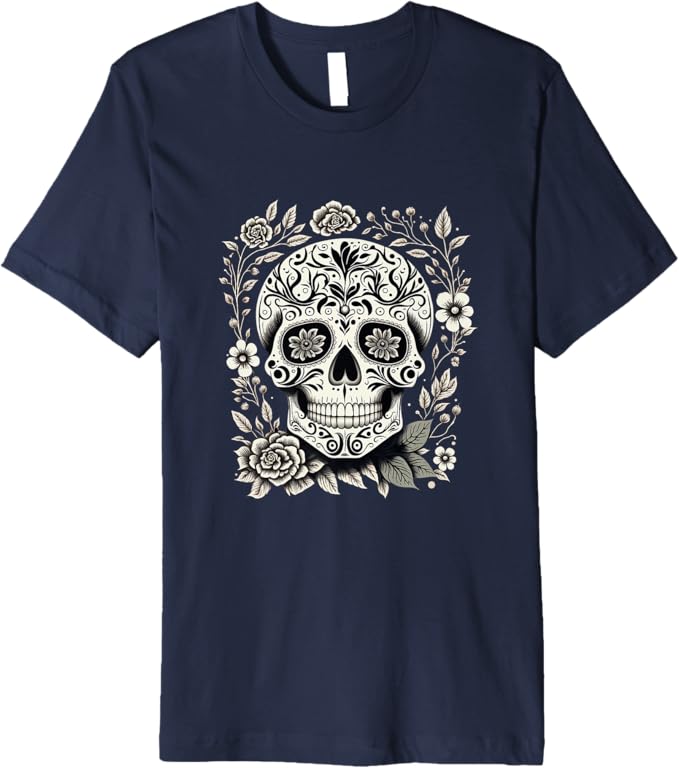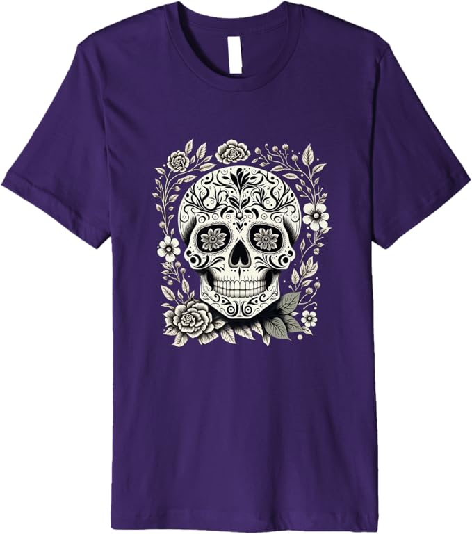 • Vibrant Dia De Los Muertos Sugar Skull Design: This t-shirt features a striking sugar skull design, a symbol of Día de los Muertos (Day of the Dead), beautifully capturing the colorful and festive spirit of the Mexican holiday.
