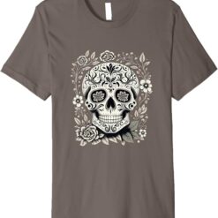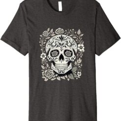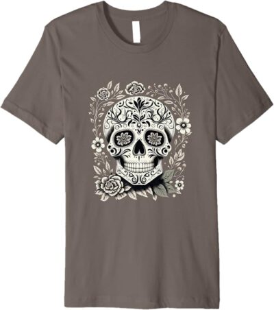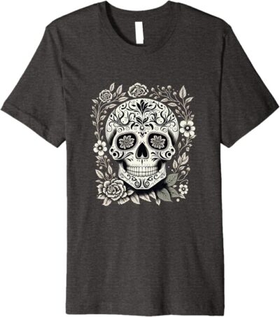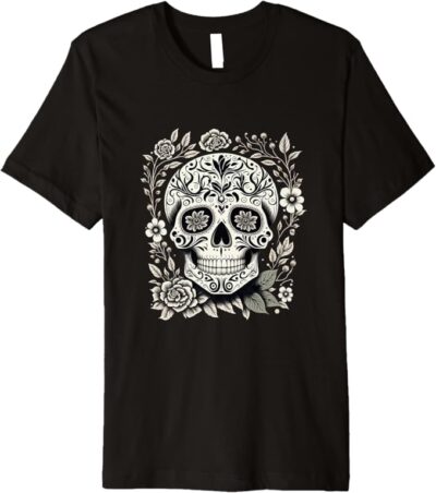 Vibrant Dia De Los Muertos Sugar Skull Design: This t-shirt features a striking sugar skull design, a symbol of Día de los Muertos (Day of the Dead), beautifully capturing the colorful and festive spirit of the Mexican holiday.
