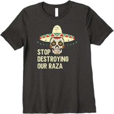 - Proud Chicano Culture Design: Featuring the bold “Stop Destroying Our Raza” message alongside a striking Mexican Chicano skull hombre graphic, this shirt is a tribute to Mexican heritage and pride in the Chicano culture.