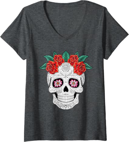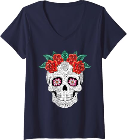 Women’s Day of the Dead Skull with Flowers Mexican Holiday V-Neck T-Shirt