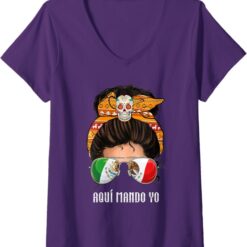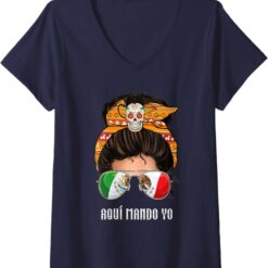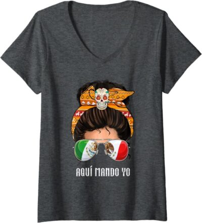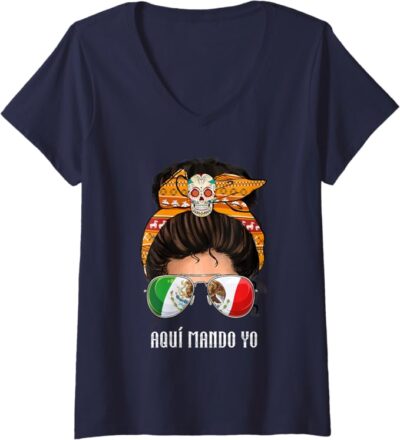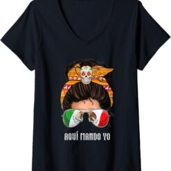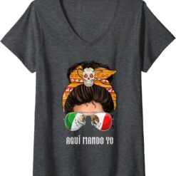 Women’s “Aquí Mando Yo” Mexican Flag V-Neck Women T-Shirt – Bandera Mexicana Mujer Shirt