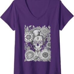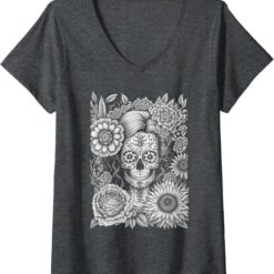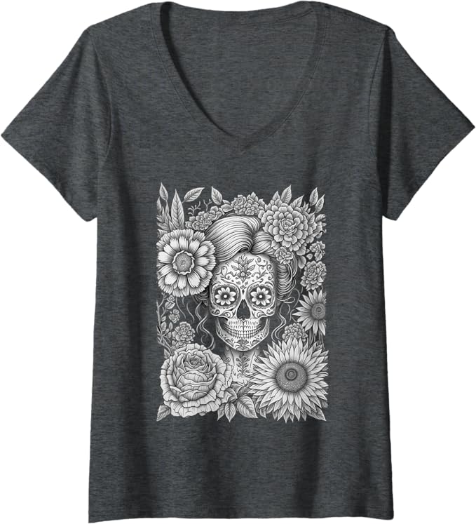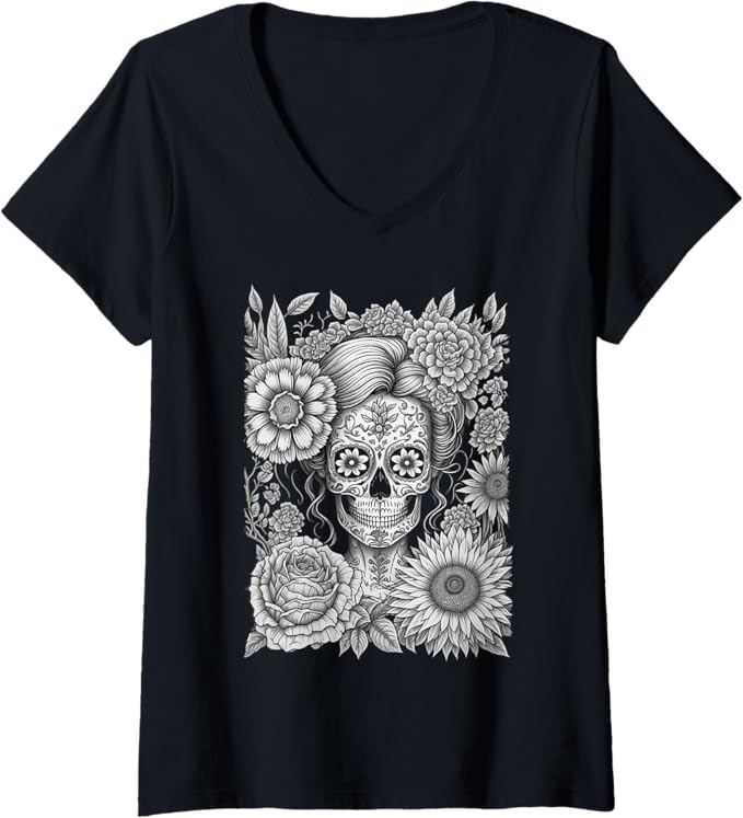 Women’s Creepy Calaveras Catrina V-Neck Women T-Shirt – Mexican Day of the Dead Holiday Shirt