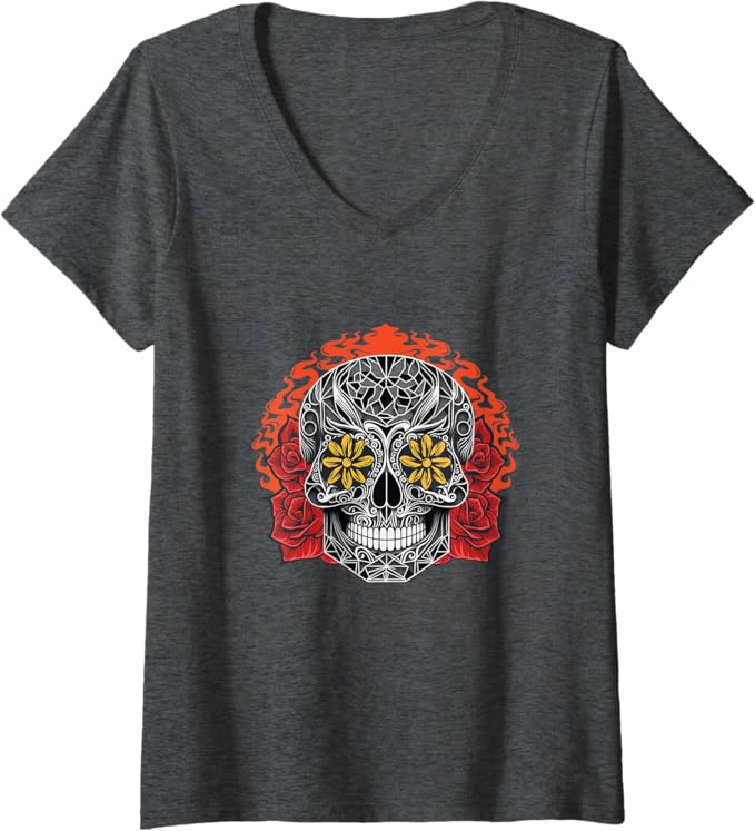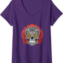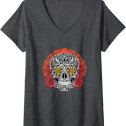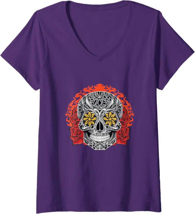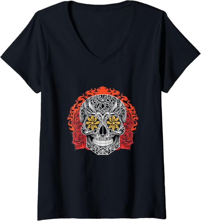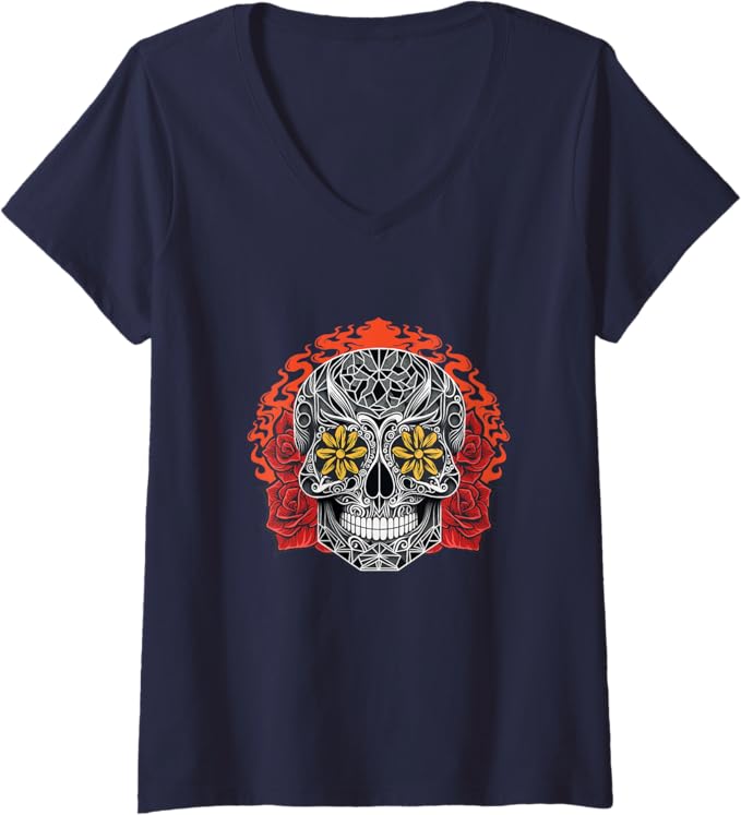 Women’s Day of the Dead Sugar Skull Calaveras V-Neck Women T-Shirt – Mexican Holiday Tee