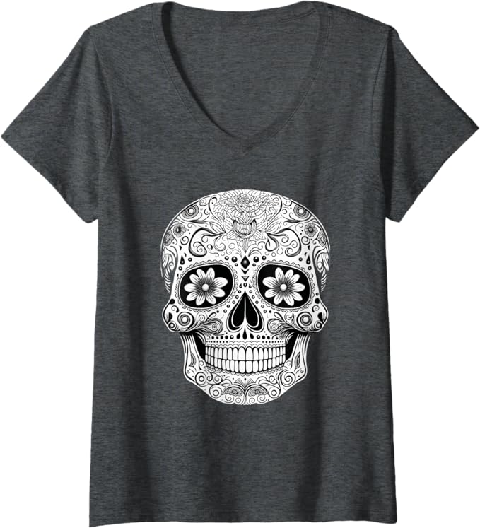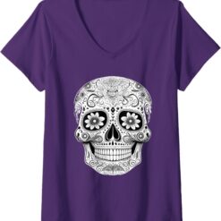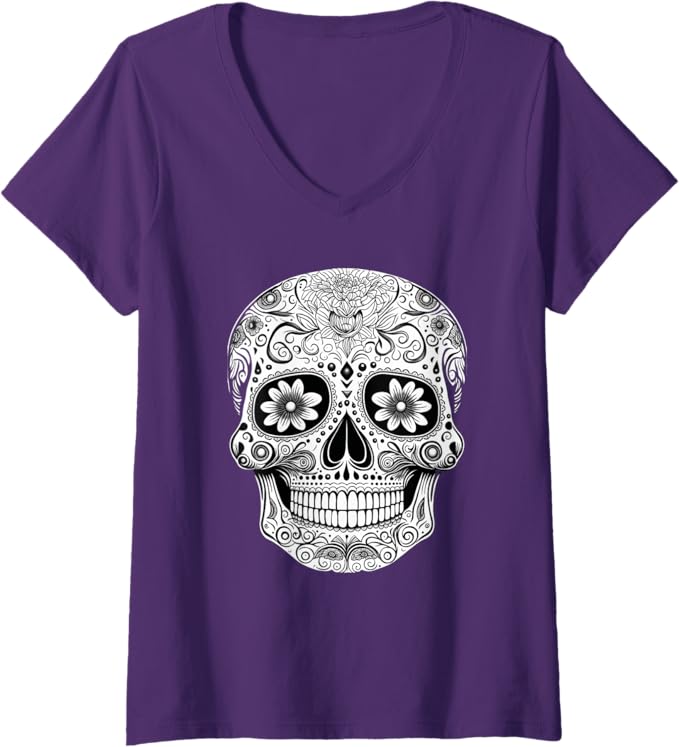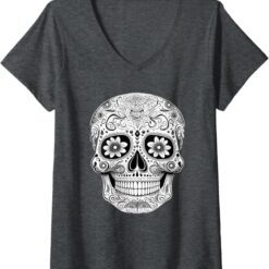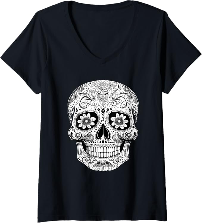 Women’s Floral Mexican Sugar Skull V-Neck Women T-Shirt – Day of the Dead Design