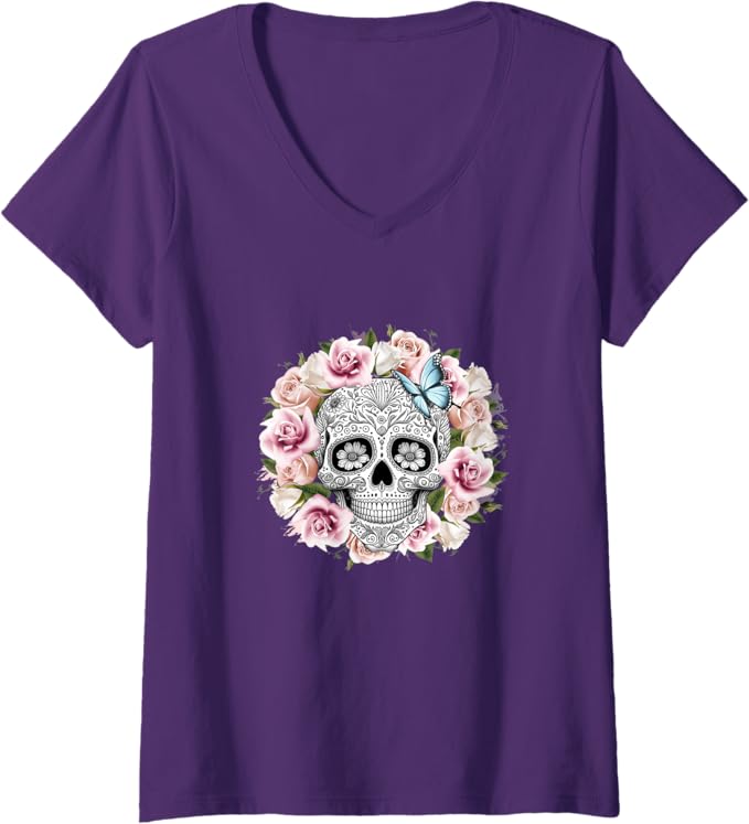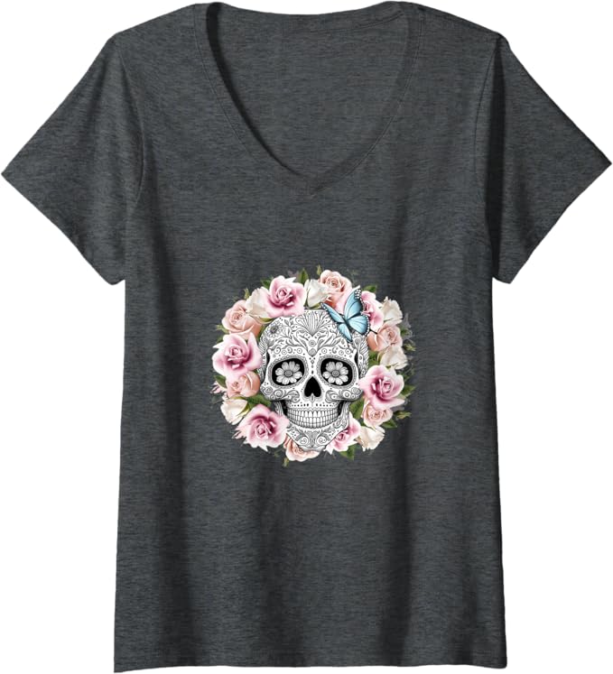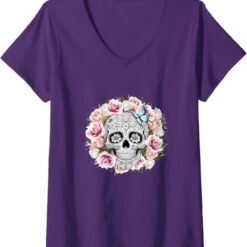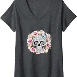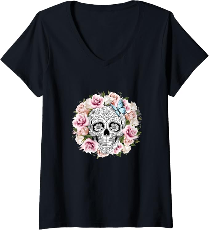 Women’s Floral Sugar Skull V-Neck T-Shirt – Day of the Dead Mexico Dia de los Muertos Shirt