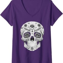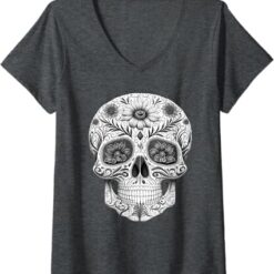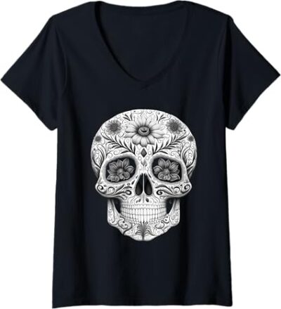 Women’s Mexican Skull Art Dia de los Muertos V-Neck T-Shirt – Unique Day of the Dead Design