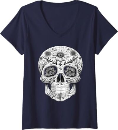 Be the first to review “Women’s Mexican Skull Art Dia de los Muertos V-Neck T-Shirt – Unique Day of the Dead Design”