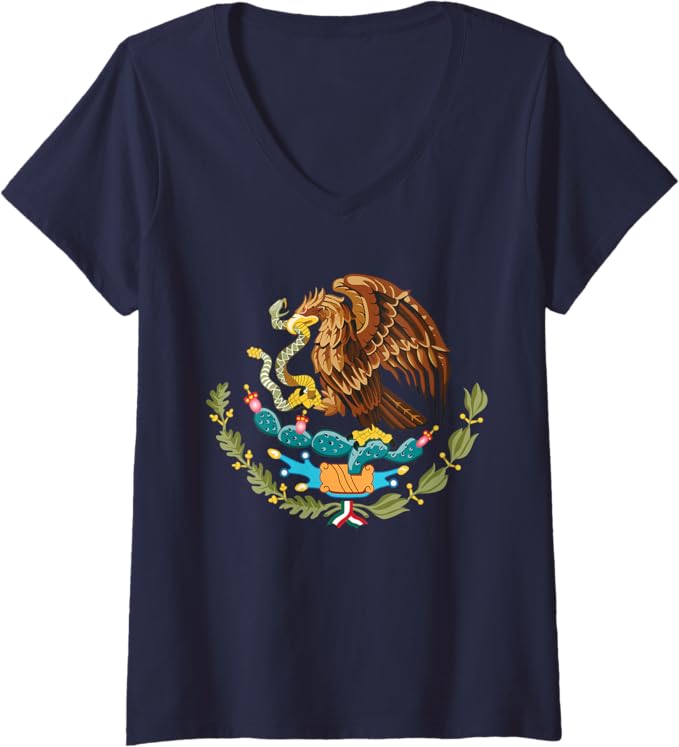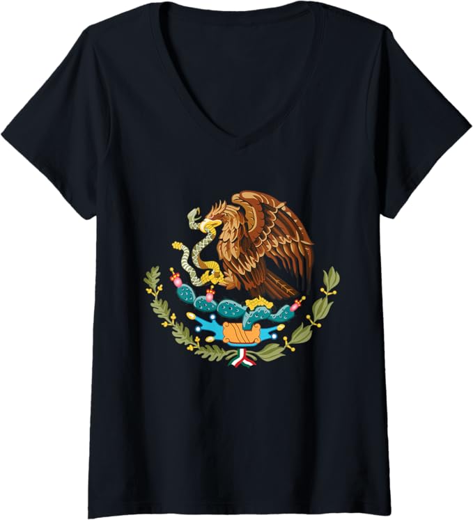 Women’s Mexican Flag Coat of Arms Aztec Tenochtitlan Eagle V-Neck Women T-Shirt with Cactus Design