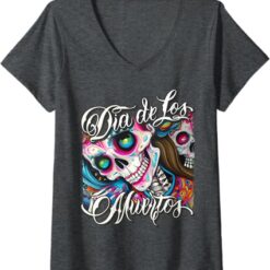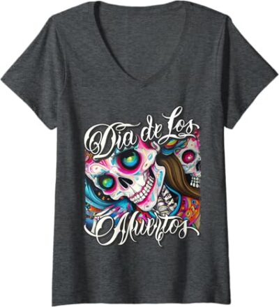Women’s Mexican Calaveras Catrina Día de los Muertos V-Neck T-Shirt – Colorful Skull Design