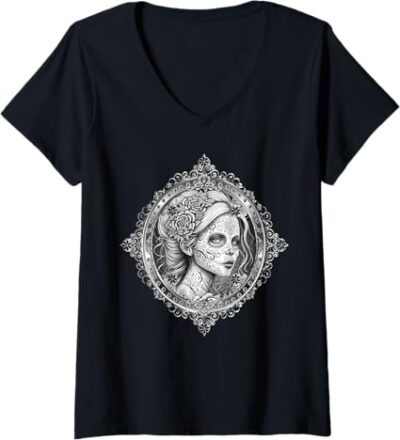 Women’s Mexican Dia De Los Muertos Calaveras Catrina V-Neck T-Shirt – Stylish Day of the Dead Shirt