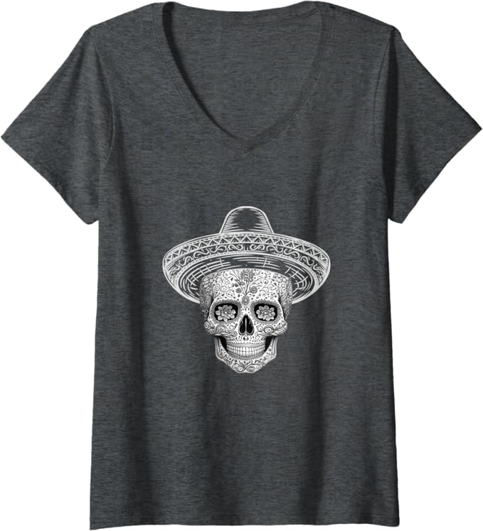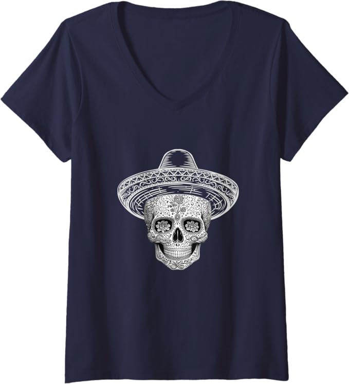 Women’s Mexican Sugar Skull Sombrero Day of the Dead Calaveras V-Neck Women T-Shirt