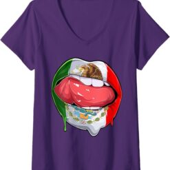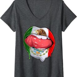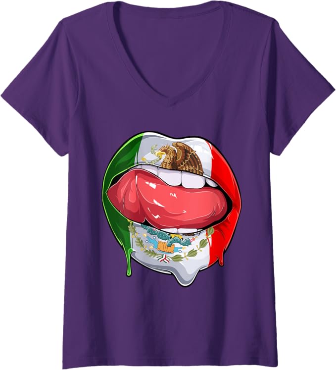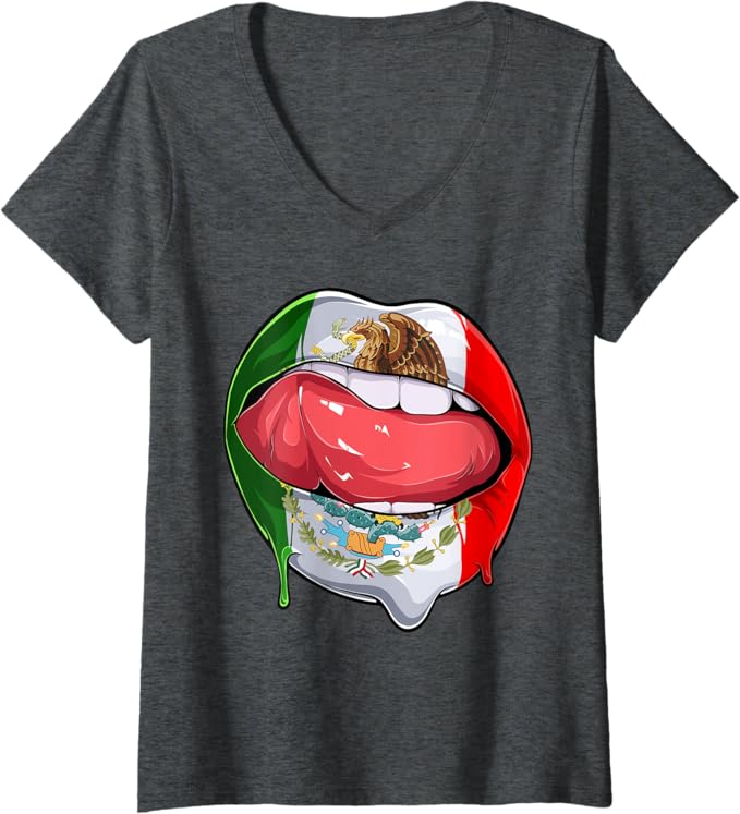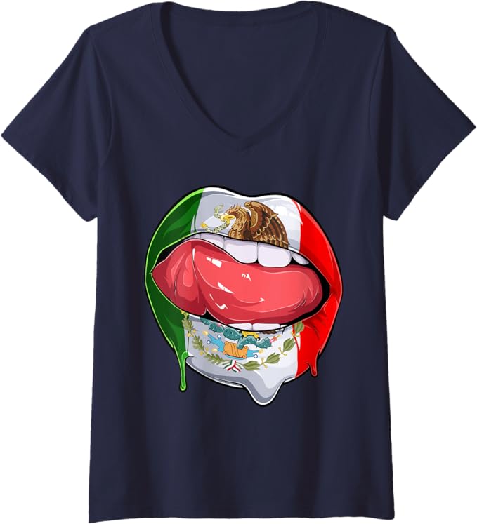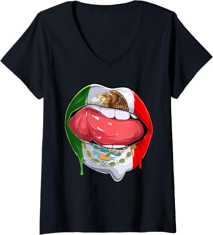 Women’s Mexico Flag Lips V-Neck Women T-Shirt – Mexican Bandera Como Labios Design