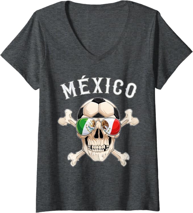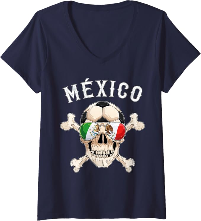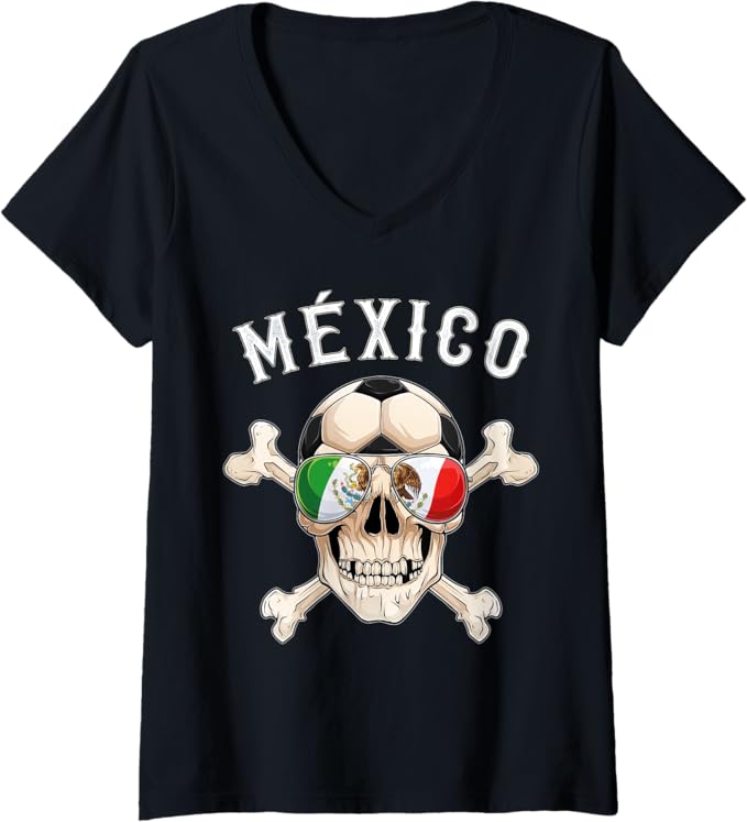 Women’s Mexico Pirate Soccer Fan Skull V-Neck Women T-Shirt with Mexican Flag