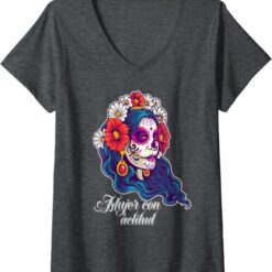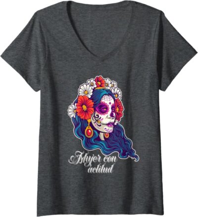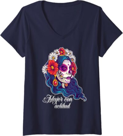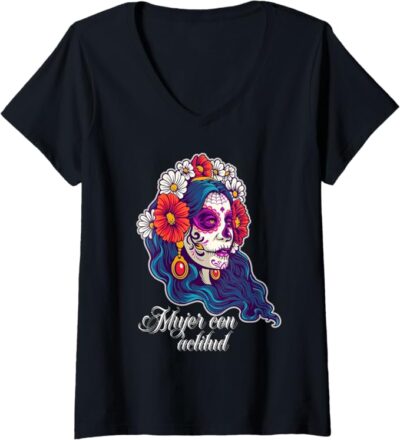 Women’s Mujer Con Actitud Mexican Sugar Skull V-Neck Women T-Shirt for Women and Girls