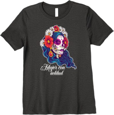 • The bold “Mujer Con Actitud” message paired with the intricate sugar skull design makes this t-shirt a statement piece for anyone who embraces their heritage and culture.